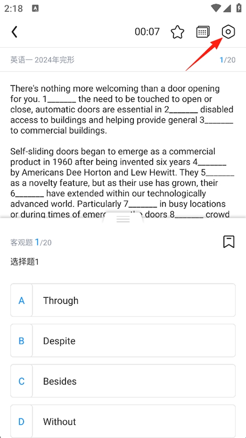 1、打开星火英语APP,在做题页面点击右上角的设置按钮;