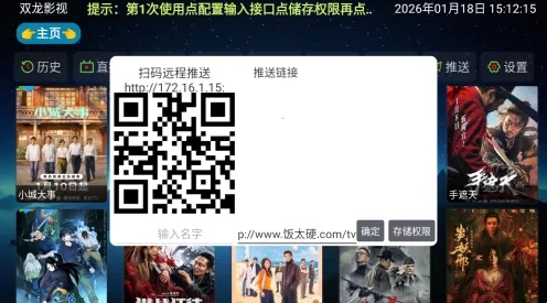 2、输入此链接,饭太硬:http://www.饭太硬.com/tv,并允许储存权限,点击确定。