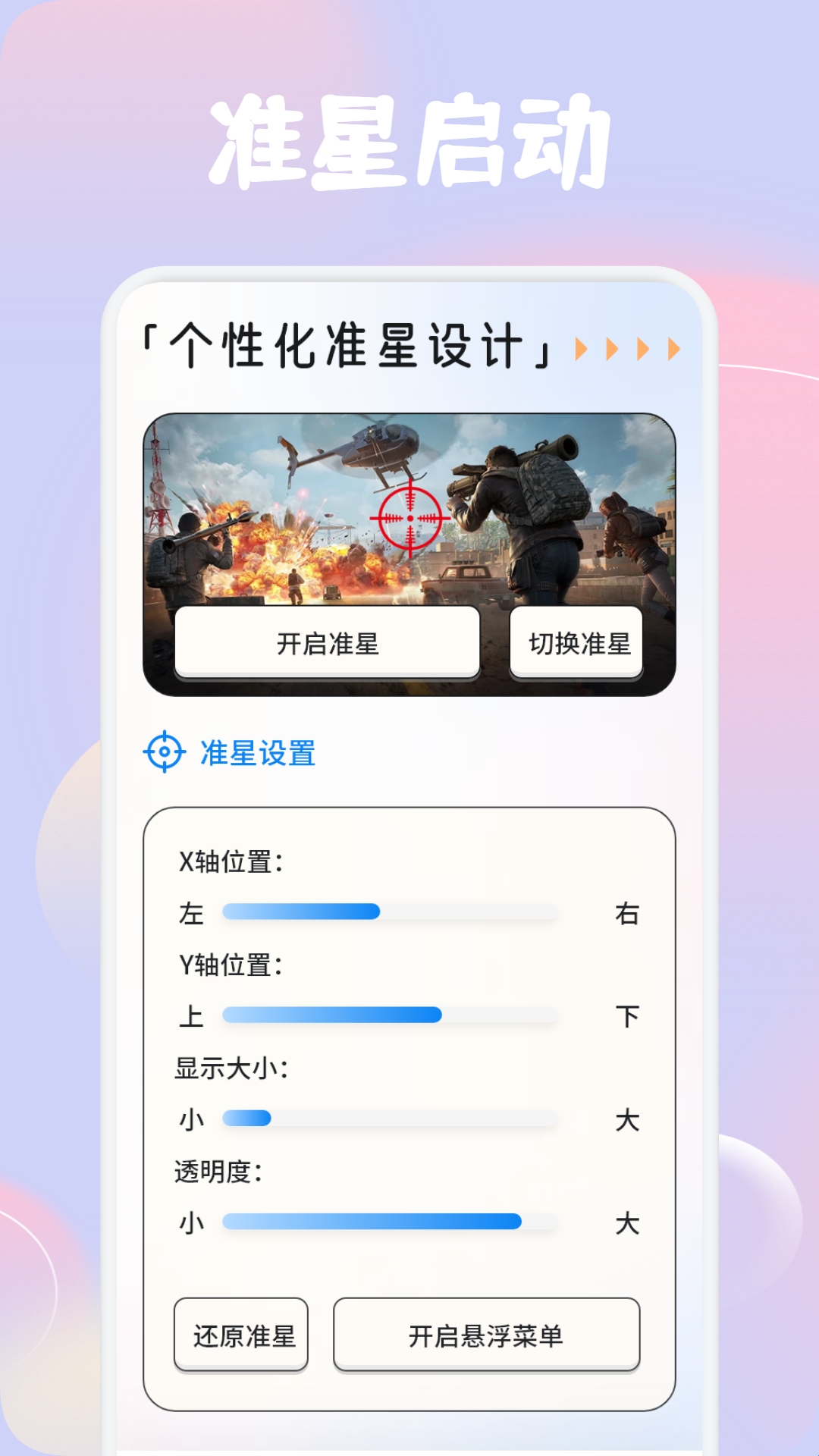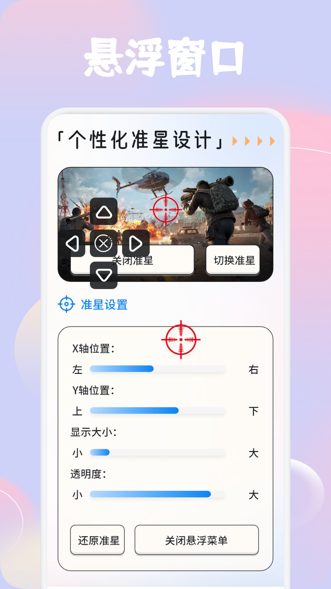 准心瞄准助手是一款为FPS手游设计的外置准星软件,该软件支持个性化准星设计,可调节X、Y轴位置、调整显示大小、透明度等,可有效提升射击精度,同时不破坏原有的游戏公平竞技环境,操作简单显著有效,支持多款热门手游,感兴趣的玩家们快来试试吧!