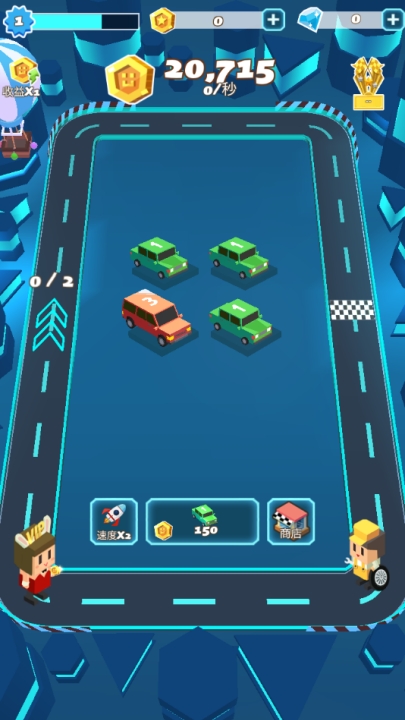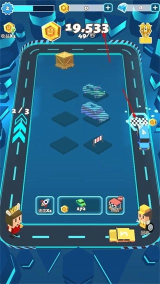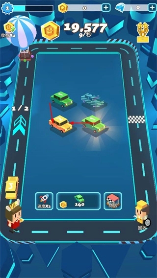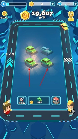 2、合成后的汽车在赛道上行驶,不同汽车行驶会带来不同的金币收益变化,同时赛道上还有其他元素。