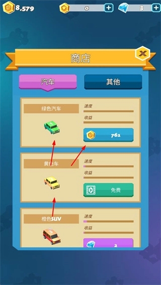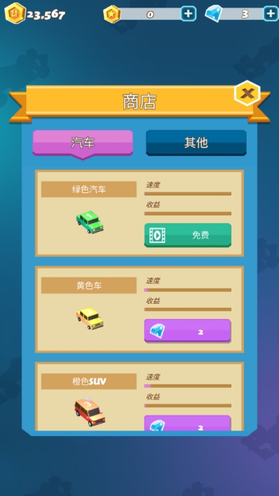 4、在商店界面,可花费金币升级汽车,提升汽车的速度和收益等属性,也可获取其他类型的汽车。