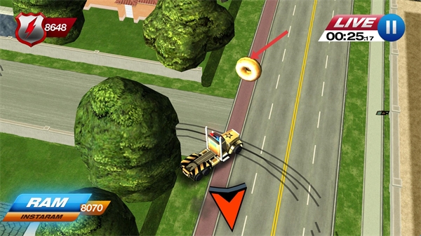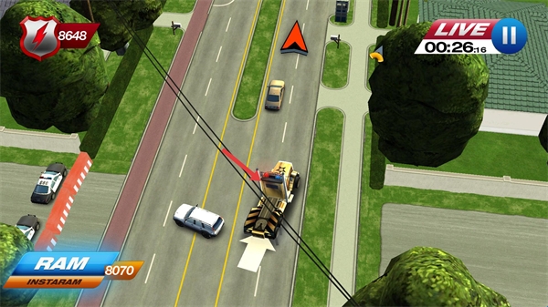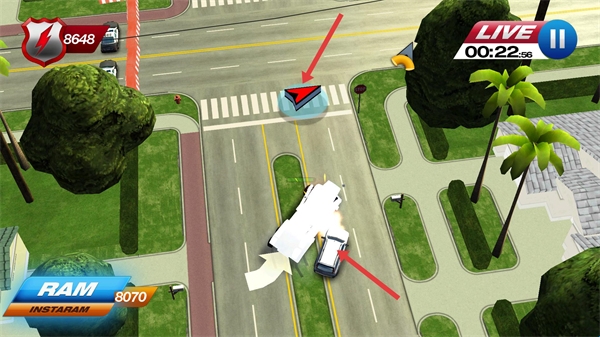 1、驾驶车辆执行任务时,需跟随指引箭头移动,避开道路上的普通车辆,推进任务进度。