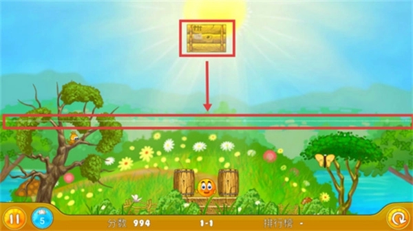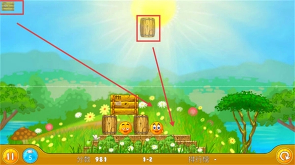 进入挑战场景后,用手指拖动屏幕中的木箱或木桶,将它们放置在橘子上方的合适位置。