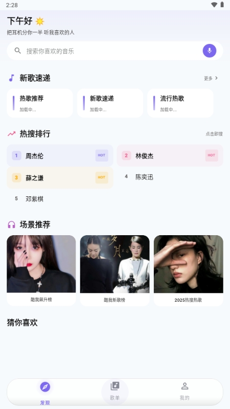 2、点击顶部的搜索框,输入查找的音乐/歌手/专辑名称;