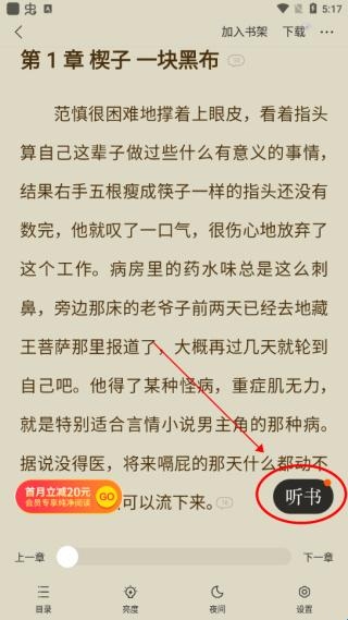 3、在阅读界面呼出菜单切换听书模式进行语音播放;