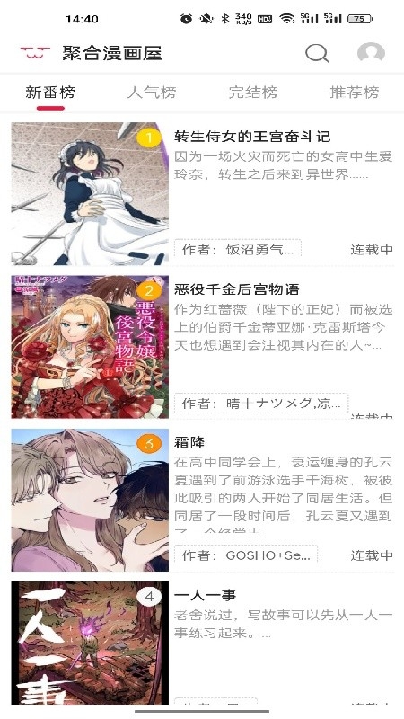 聚合漫画屋是一款功能强大的漫画阅读软件,内含言情、热血、悬疑、玄幻等多种主题小说,且支持关键字搜索与个性化推荐等多种漫画搜索方式,帮助用户更快找到心仪的作品,软件内还支持翻译功能,可轻松观看其余各国漫画,感兴趣的小伙伴们快来试试吧!