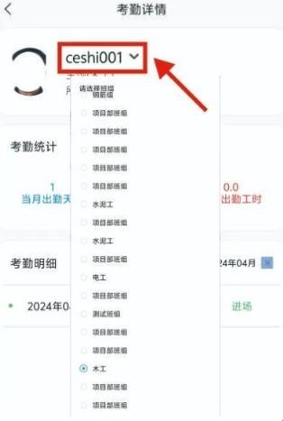 5、选择需要查看的项目班组考勤,然后点击下拉项目班组。