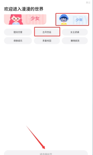 2、在欢迎页,选择被框选的少年标签。