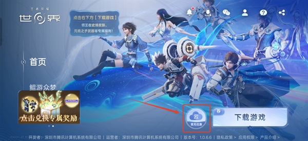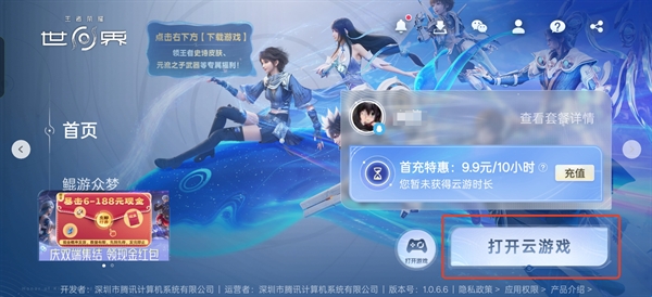 3、接着右下角的按钮就替换为打开云游戏了,点击即可启动王者荣耀世界云游戏。