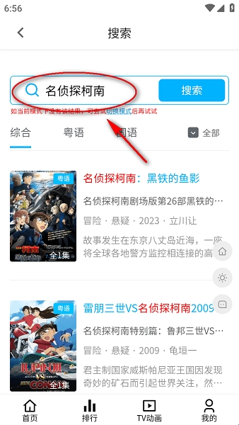 2、比如搜索名侦探柯南,下面就会出现相关的动漫作品,如图所示;