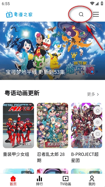 1、打开粤漫之家app后,点击左上角的放大镜图标,就可以搜索动漫;