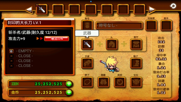 1、人物状态(STATUS)。这里看得到你的人物状态,包括各种属性点数。第一排:ATT(ATTACK)攻击,DEF(DEFENCE)防御,HIT(HITRATING)打击率(即命中)。第二排:CRI(CRITICAL)致命一击,C.DMG(CRITICALDAMAGE)致命伤害(加成伤害),EVA(EVASION)闪避,C.EVA(CRITICALEVASION)致命闪避。这里的致命一击也好闪避也好,不是指的几率,就是说你即便把致命一击堆到100也不会每次都打出致命。这个是有一定的计算公式的。第三排:STR(STRENGTH)力量,DEX(DEXTERITY)敏捷,CON(CONSTITUTION)体力,INT(INTELLIGENCE)智力。
