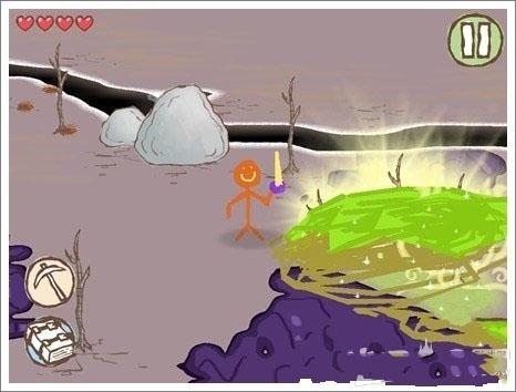 5、向右边的方向前进,可以避免靠近蓝紫色的岩浆。玩家可以到达下面的位置,然后用下方的树叶画笔在三个干枯的树枝上画树叶就可以通过岩浆了。