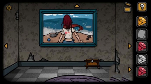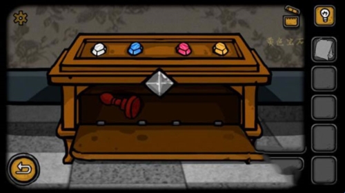 9、在切换到海报的房间。点击海报下面的宝箱,将钻石按照小鸟的颜色排列方式进行排列,就可以打开这个箱子,获得一个印章。