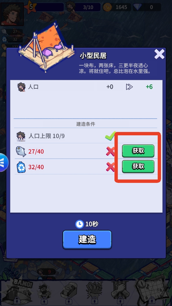 2、达到所需要的建造条件,如果没有达到可以点击右边的获取去完成。
