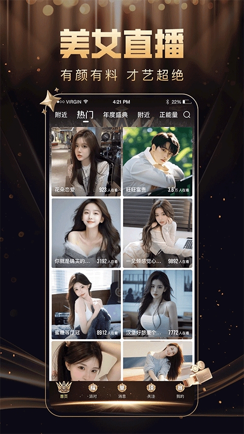 金雀直播是一款主打高颜值互动的视频社交平台,全天24小时都有直播。里面内容特别丰富,才艺表演、游戏组队、语音聊天应有尽有。平台玩法超多,支持连麦PK、礼物互动、同城交友,还会定期上线趣味主题活动,互动感十足。金雀直播间app所有直播内容都会严格审核,环境干净健康又绿色。既能休闲看直播打发时间,又能轻松线上交友,日常娱乐解压特别合适。