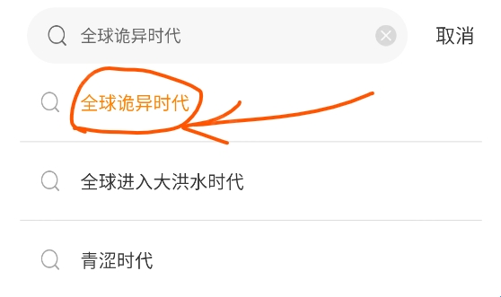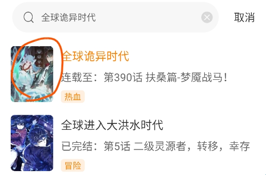 2、输入您想看的漫画名称、作者或主角名称,以《全球诡异时代》为例,然后点击搜索结果中圈出的漫画名称。