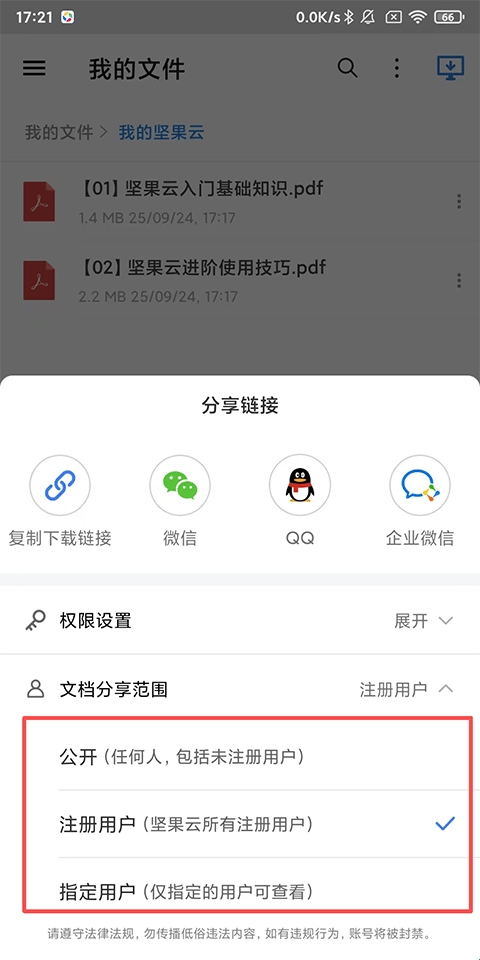 5、文档分享范围:公开/注册用户/指定用户,可根据需求进行设置。