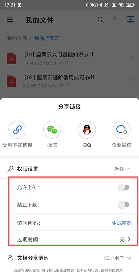 4、权限设置:是否允许上传/禁止下载、设置访问密码、过期时间等;