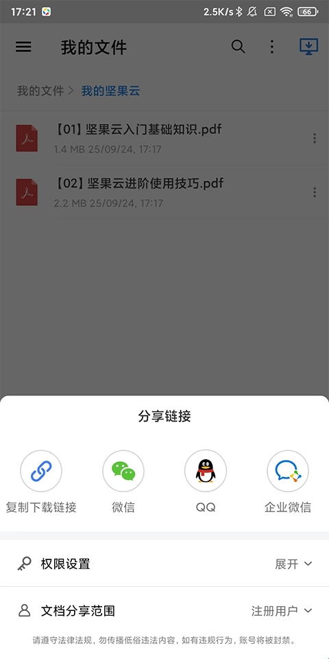 3、在弹出的快捷菜单中选择分享链接的方式,如;复制下载链接、微信、QQ、企业微信等;除此以外还可对分享链接设置权限及分享范围;
