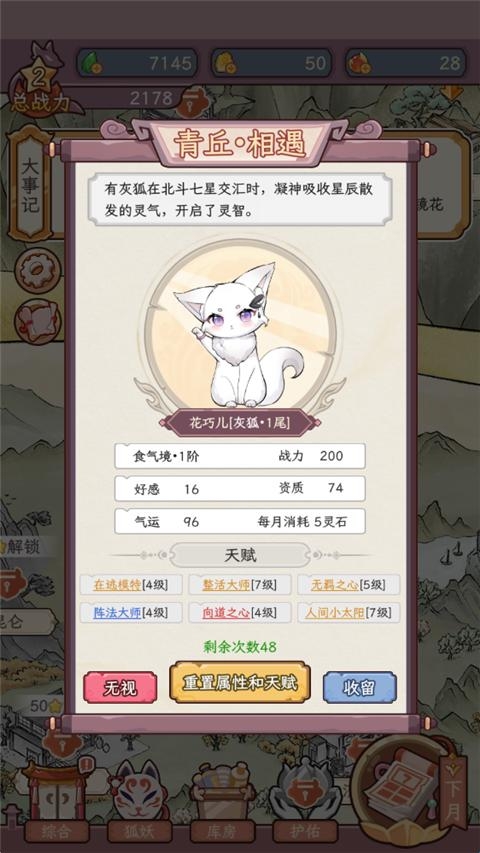 2、小狐狸有自带的属性,玩家可以重置属性以及天赋;