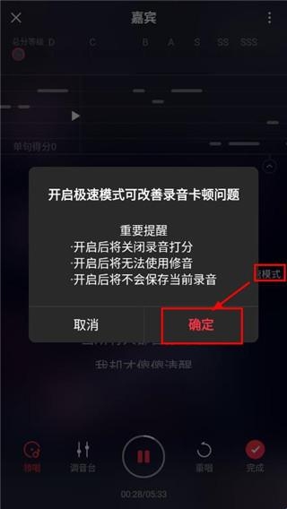 8、在中间部分有一个极速模式,如果需要的话可以开启;在演唱界面的中间部分,你可以看到“极速模式”按钮;如果你希望加快合成速度,可以点击该按钮开启极速模式;这样,你的演唱与伴奏的合成过程会更加迅速高效。