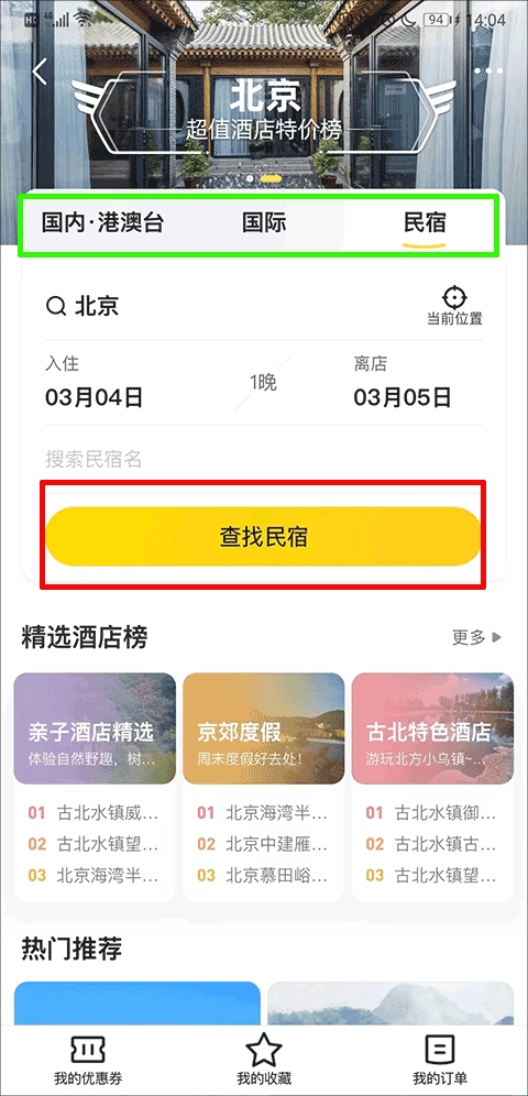 2、在选酒店界面,选择好住宿类型后找到并点击“搜索酒店”或“查找民宿”选项。软件支持蜂友们在此选择的住宿类型有国内港澳台、国际、民宿;
