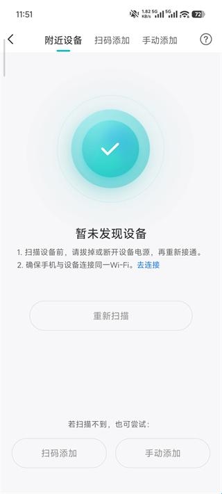 2、App自动扫描附近设备。若提示“暂未发现设备”,可选择手动添加