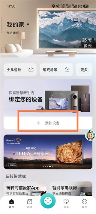1、打开海信爱家App→进入首页,点击“+添加设备”