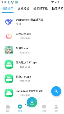 3、如图,可在每日应用找寻要下载的app,也可点击右下角蓝色搜索图案进入搜索。