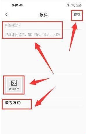4、最后在报料页面,输入标题、详细说明、添加图片、联系方式,点击【提交】。