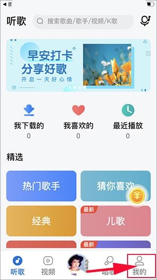 1、下载好软件打开,我们会看到软件下方有听歌,视频,唱歌,我的,选项。