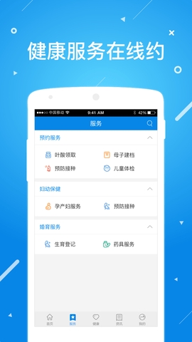 【在线预约服务】居民用户可在线进行叶酸领取、母子建档、预防接种、儿童体检等相关预约服务,免除线下排队挂号的烦恼;