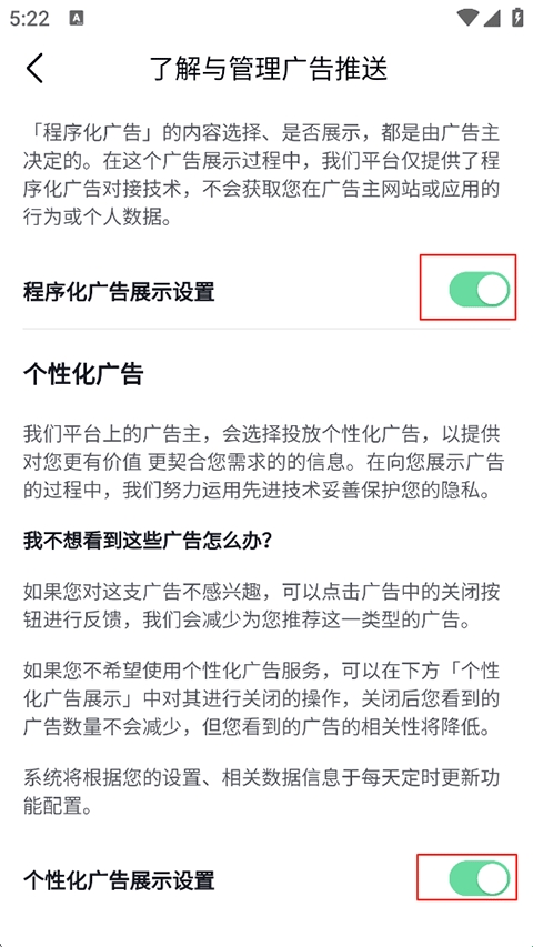 4、找到“程序化广告展示设置”与“个性化广告设置”,关闭即可。