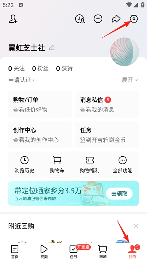 1、打开今日头条App,点击右下角“我的”,再点击右上角“设置”;