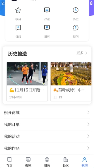提供收藏、评论、历史等互动功能,还有积分商城、我的订单等服务,方便用户管理个人账号与参与平台互动。