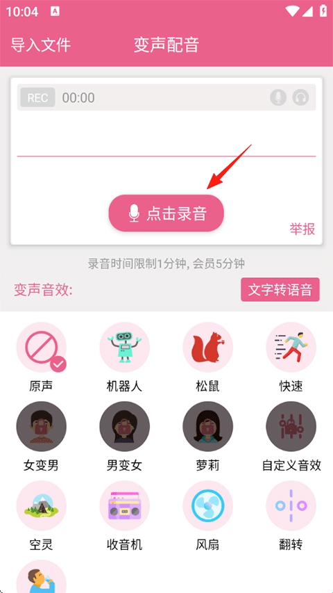 2、点击录音或者右上角导入文件,然后在下方选择变声音效,完成后确认无误即可发布作品到平台;