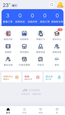 菜鸟包裹侠(包裹侠)APP是一款面向专业快递员的办公软件。软件提供便捷的管理模块以及强大的抢单功能,用户登录账号识别快递员的身份,就可以进行抢单,根据用户给出的定位,智能推荐周边的优质订单,寄件、送件信息都很明确,可以随时在线与客户沟通,完美对接中通、韵达、圆通等快递公司,轻松完成配送任务,海量订单抢到手软。