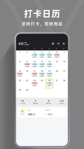 1、能够通过每日打卡功能,拒接拖延,掌握体重变化信息。