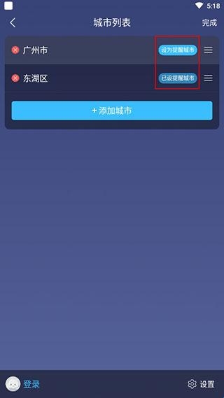 4、在城市列表页选择编辑可以设置需要主动提醒的城市。