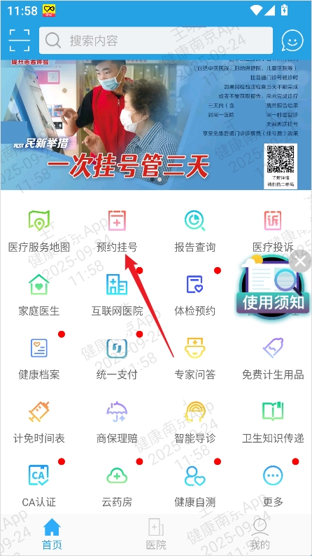 1、进入健康南京App首页,点击【预约挂号】。