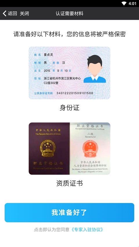 3、专家入驻需要我们先填写入驻申请,主要是提交身份认证和资质认证。
