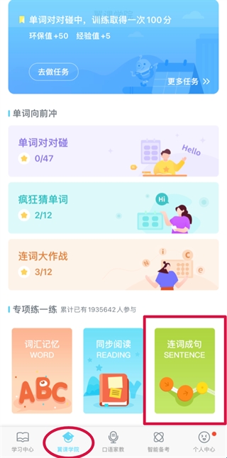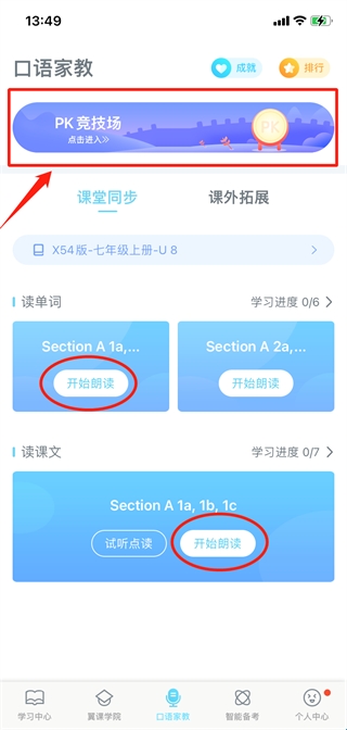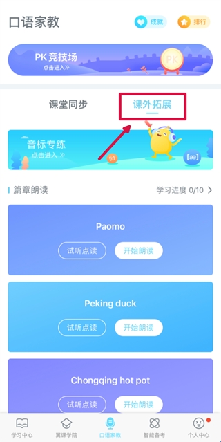 翼课学生APP中的口语家教,同步五四制教材、课时,学生练习完口语系统自动评分