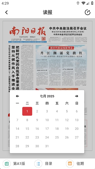 3、进入读报界面,下方可以选择报纸日期,目录和版面