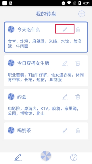 大转盘小决定APP这是一款非常实用的,且可以帮助用户快速做出决定的软件,非常适合选择困难症的小伙伴们下载使用。提供了转盘做决定的功能,用户点击转盘便会自动得到相应的结果,让你做决定时不再犹豫不决,给你一个更好的解决方案。用户可以自定义转盘的内容,标题、选项、转速都可以自定义,丰富的功能能够满足不同使用需求的用户。