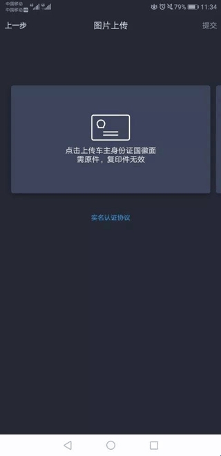6、依次上传车主身份证国徽面、车主身份证人像面及车主手持身份证照片并点击【提交】按钮,完成实名认证申请