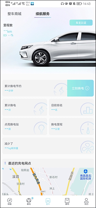 3、在爱车界面,用户可以一键预约试驾或直接订购,订购后还可以续航服务中享受车联网功能,解锁查看积累换电次数、已点亮换电站等专属信息权益,以及查找充电网点为车辆换电