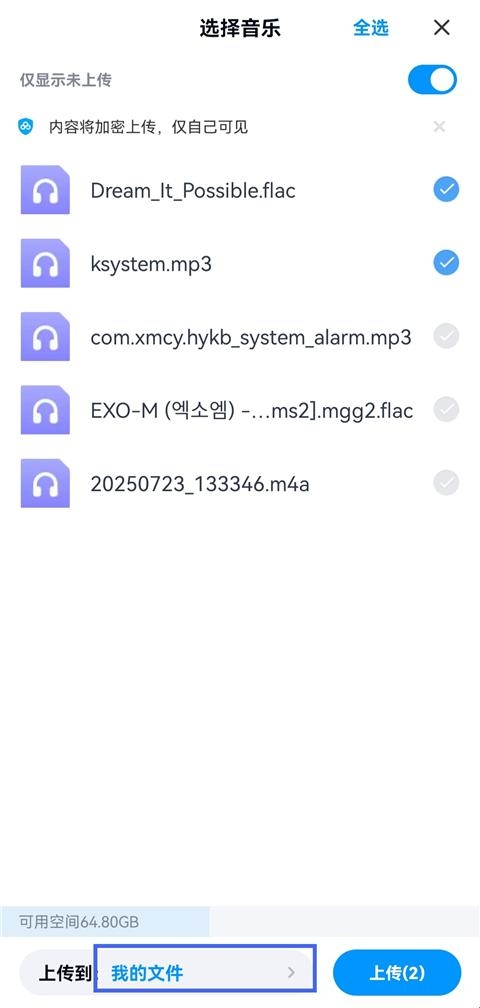 3、已上传音乐为例,勾选要上传的文件,再点击左下角“选择上传位置”下的文件夹。