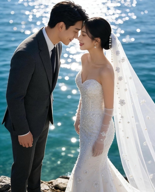 新娘:黑色直发,韩式低盘发,留有碎发丝。妆容为清透奶油肌,自然野生眉,正红色丝绒唇。身着抹胸心形领口鱼尾婚纱,通体点缀立体小花、珠片刺绣。佩戴超长飘逸头纱(2-3米),上有稀疏立体花、珍珠装饰。可选珍珠耳饰与薄纱长手套。